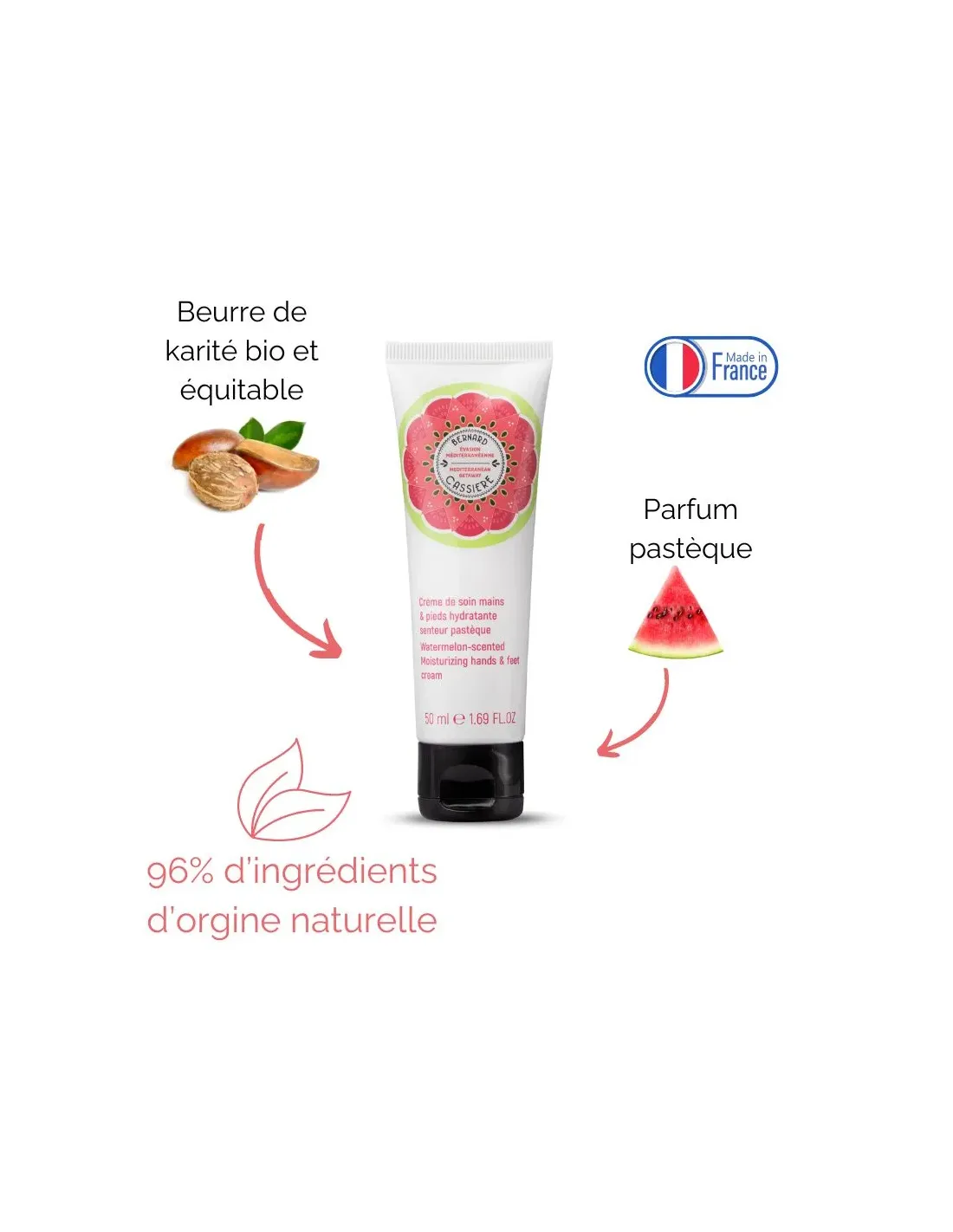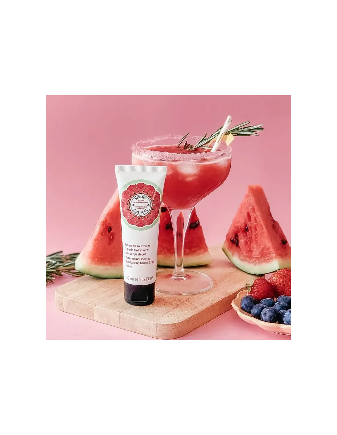 Close your eyes... and this cream will instantly transport you to a Mediterranean holiday ! Its sweet watermelon scent evokes beautiful summer days, and its rich and delicious texture, enriched with shea butter, is a real pampering care for visibly perfect hands and feet ! Say goodbye to dry patches, your skin is well hydrated, nourished and supple.