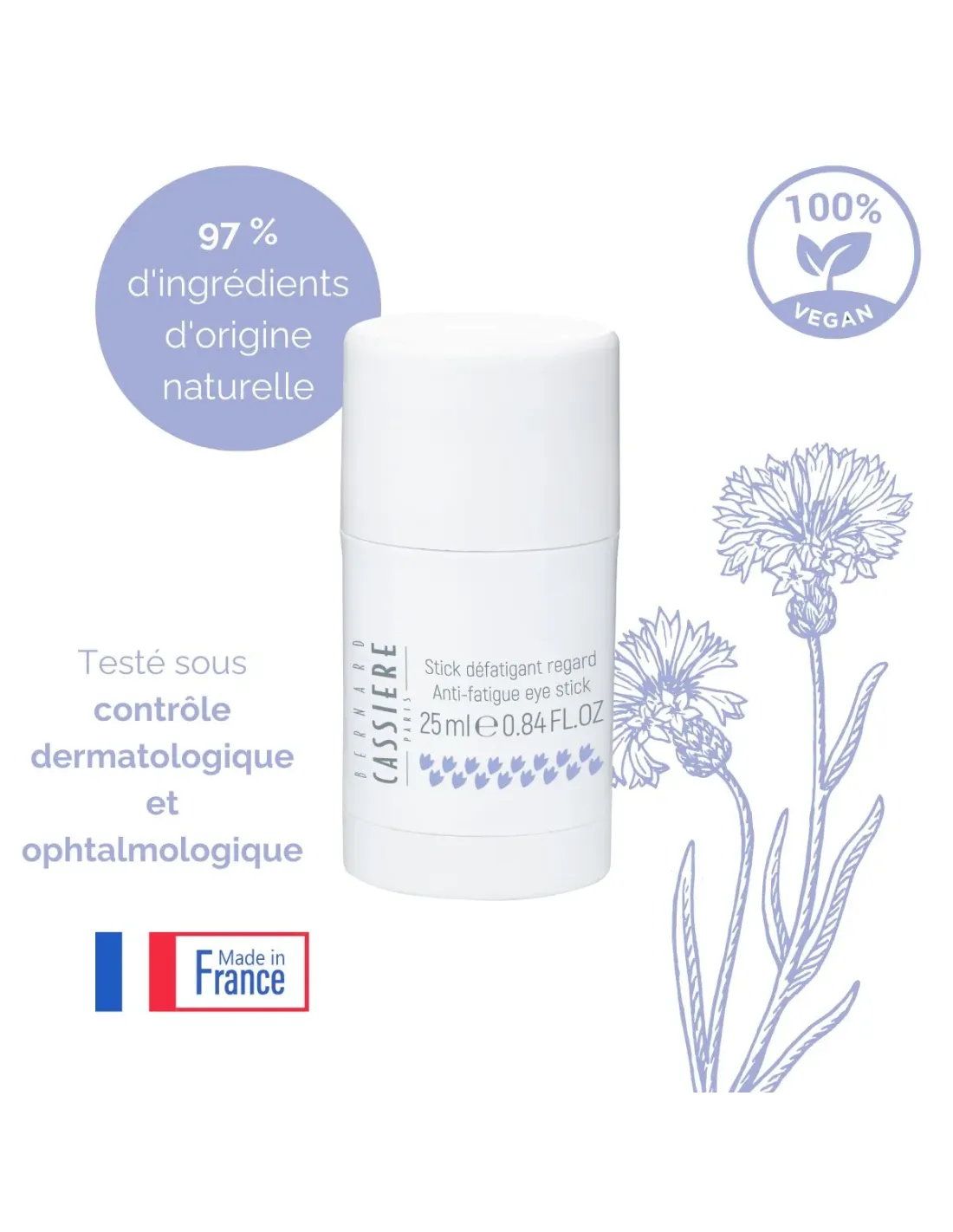 Fondez pour la texture fraîche et inédite de ce stick défatigant qui apporte une véritable dose d’hydratation au contour de vos yeux. Grâce à l’extrait de bleuet d’Auriac aux propriétés apaisantes, cultivé biologiquement dans nos jardins, un polyphénol d’avocat upcyclé* à l’effet anti-cernes** et l’extrait de marronnier, la formule de ce soin quotidien diminue visiblement les gonflements de cette zone délicate.